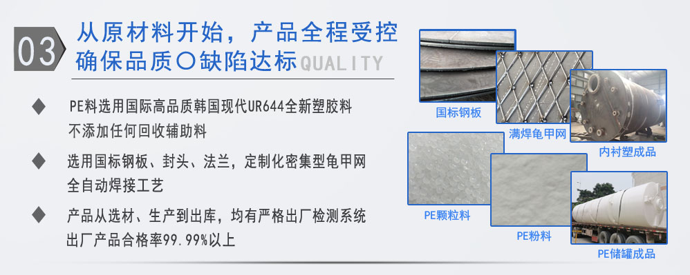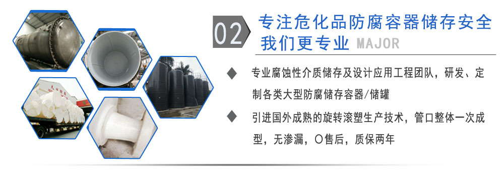公司有鋼襯塑PE/PO、PE全塑、碳鋼、不銹鋼四大系列100多個品種,專注于常壓儲存容器生產,其產品包括鋼襯塑儲罐管口一體成型PE儲罐、碳鋼儲罐、不銹鋼儲罐、反應釜、攪拌罐、離子交換柱、鋼襯PE/PO儲罐、塑料儲罐鹽酸儲罐、硫酸儲罐等等。更大限度滿足廣大客戶的各種需求,同時可以根據客戶的需要加工定制各種防腐設備。